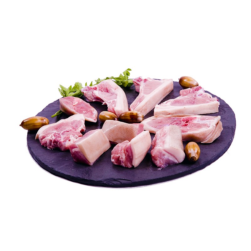Cerdo de entre 45 y 60 días. Se presenta troceado en piezas de 5 a 10 cm. Piezas de exquisito sabor y aroma intenso, crujiente por fuera y jugosas por dentro.