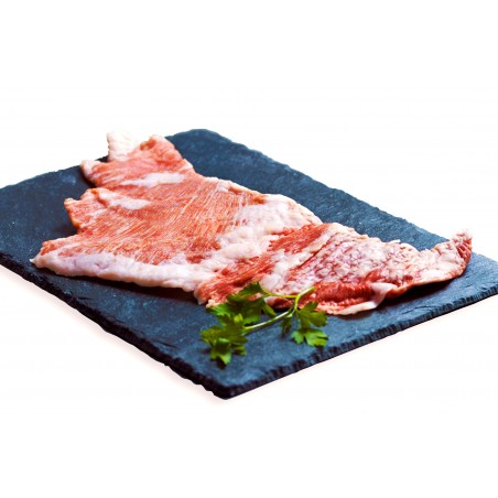 El secreto ibérico forma parte del extremo superior de la falda y se halla también próximo al cabecero de lomo. En el despiece tradicional va unido al “tocino de lomo” u “hoja de tocino”. Compuesta por fibras musculares y grasa entreverada, forma unos filetes de unos 150 a 200 gramos.