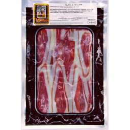 Caja con blísteres de 150 gramos cada uno, loncheado a máquina, listo para abrir y degustar con familia, amigos y comensales más apreciados.